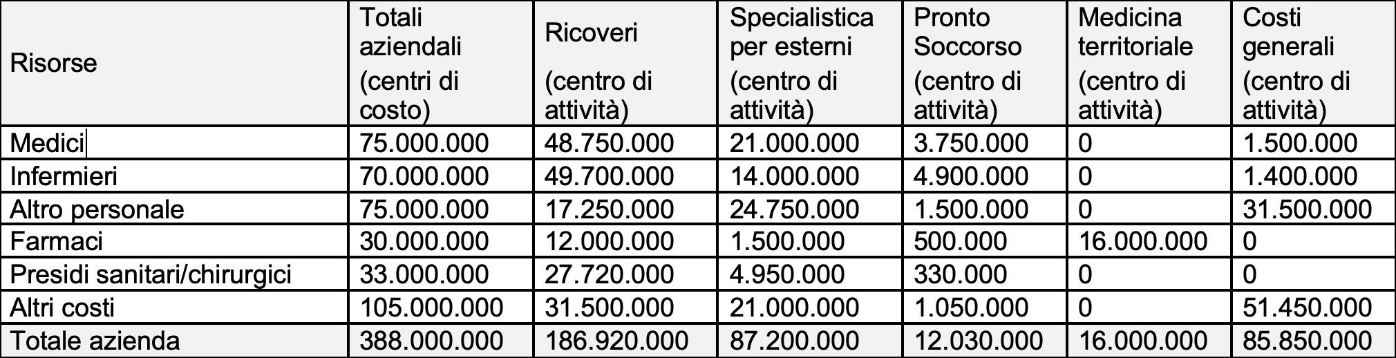 Sagredo, responsabile del controllo di gestione di Roccagialla, e Simplicio, responsabile del controllo di gestione di Roccarosa, con l’aiuto di Salviati (un economista sanitario amico di Sagredo), sono riusciti a determinare i costi delle loro aziende secondo la metodologia dell’activity costing, ovvero ripartendo le risorse tra i seguenti livelli d’attività: ricoveri; specialistica ambulatoriale; Pronto Soccorso; farmaci in distribuzione diretta (medicina territoriale). Al riguardo, Sagredo ha un quesito per Salviati.