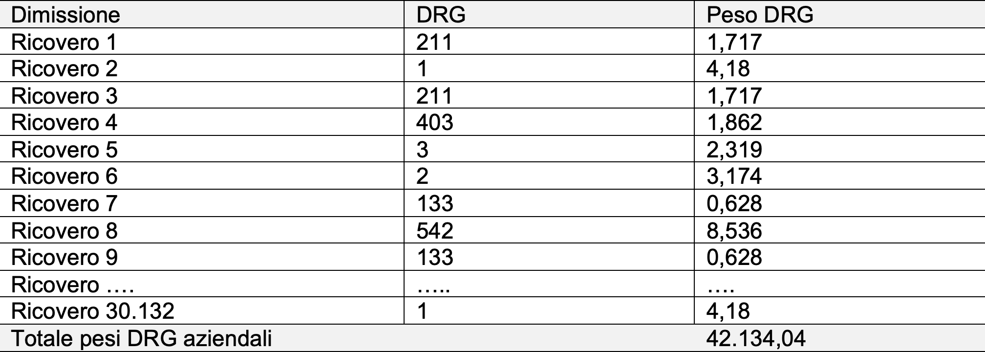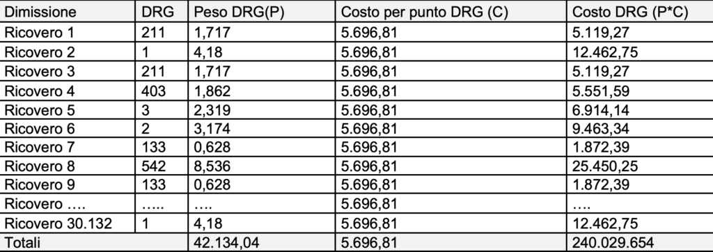 Salviati: «Anzitutto, se si vogliono impiegare i pesi DRG per determinare i costi dei ricoveri, è necessario individuare il totale dei pesi DRG relativi ai ricoveri di tutta l’azienda. A ogni dimissione è associato un DRG. Ogni DRG presenta un dato peso: la sommatoria dei pesi DRG di tutte le dimissioni consente di determinare il totale dei pesi DRG aziendali».