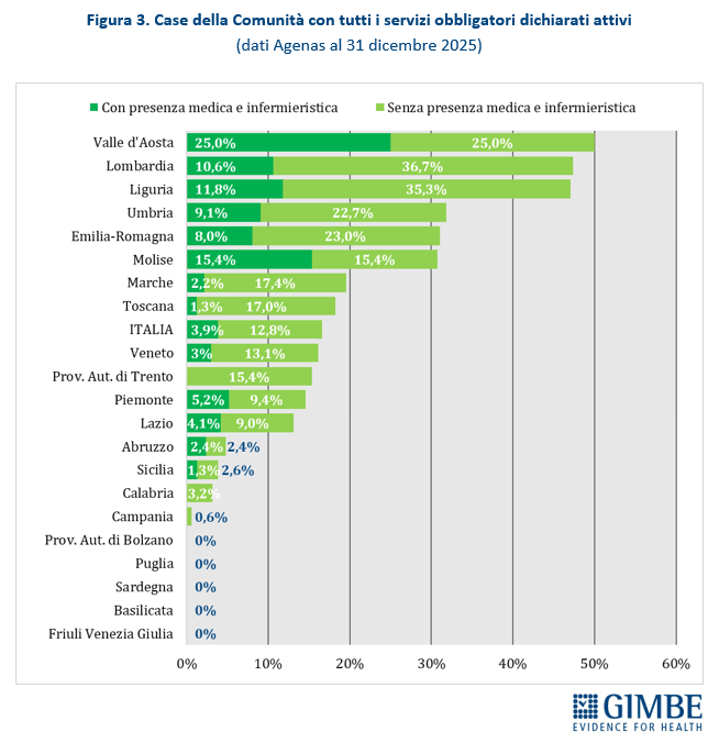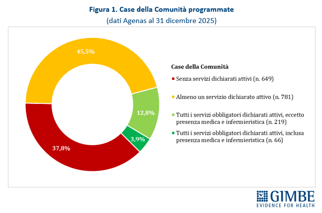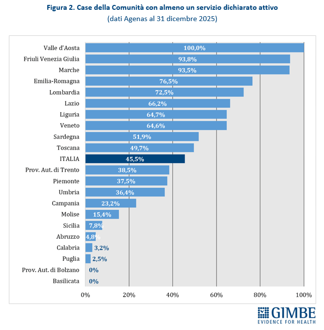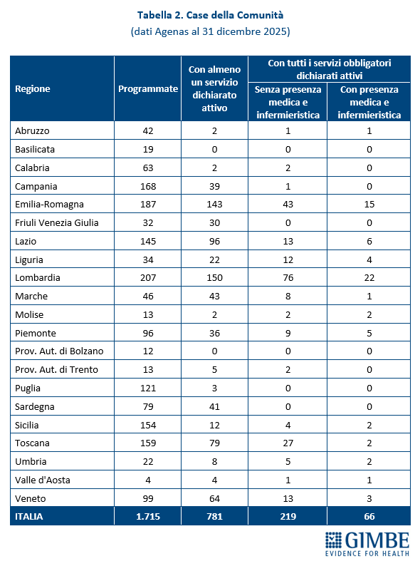 «Rispetto alla fotografia scattata da Agenas tre mesi fa, è plausibile che il quadro sia migliorato. Tuttavia, l’attivazione di Case della Comunità e Ospedali di Comunità procede con una lentezza inaccettabile, a velocità diverse tra le Regioni e frenata dalla mancata attivazione di tutti i servizi e dalla carenza di personale». Infatti, tra giugno e dicembre 2025, a fronte di un incremento di 121 Case della Comunità con almeno un servizio attivo, quelle con tutti i servizi obbligatori dichiarati attivi sono 51 (42,2%) e quelle anche con presenza medica e infermieristica solo 20 (16,5%).