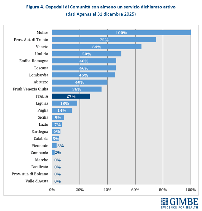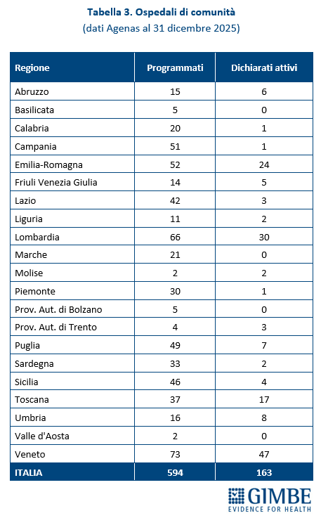 Al 31 dicembre 2025, dei 594 Ospedali di Comunità programmati, solo 163 (27,4%) risultano avere almeno un servizio attivo, per un totale di oltre 2.900 posti letto.