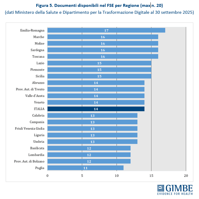 Al 30 settembre 2025, secondo i dati del portale Fascicolo Sanitario Elettronico 2.0, nessuna Regione rende disponibili tutte le 20 tipologie di documenti previste dal DM 7 settembre 2023. Il livello di completezza varia dai 17 documenti dell’Emilia-Romagna agli 11 della Puglia.