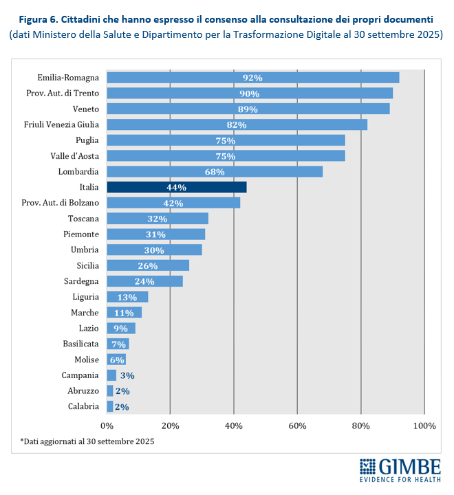 Al 30 settembre 2025, solo il 44% dei cittadini ha espresso il consenso alla consultazione del Fse da parte di medici e operatori del Ssn, con forti disomogeneità regionali: dal 2% in Abruzzo e Campania al 92% in Emilia-Romagna. Tra le Regioni del Mezzogiorno, solo la Puglia supera la media nazionale (44%), raggiungendo il 75%.
