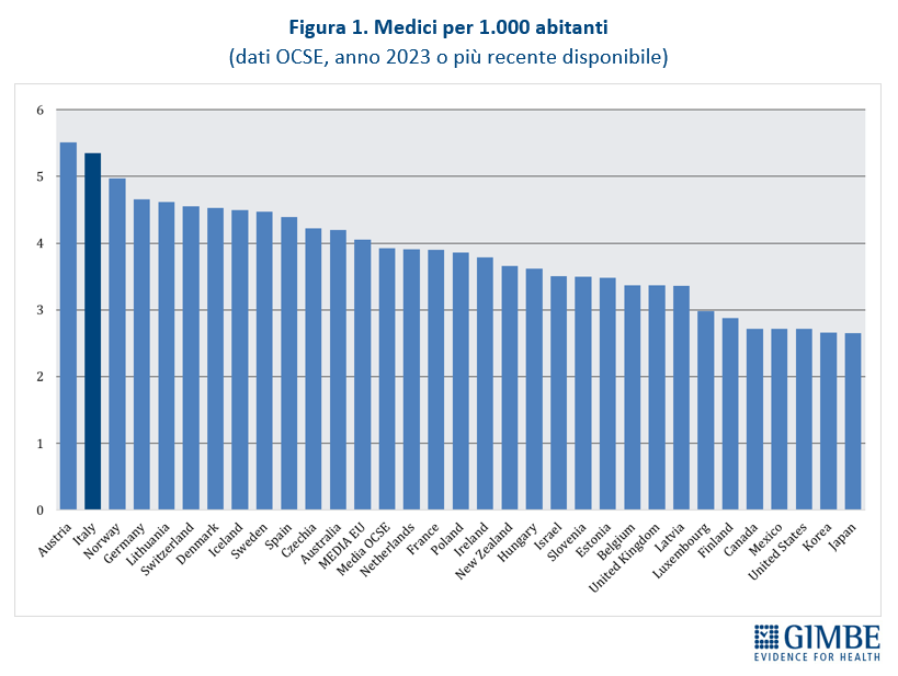 Il confronto tra il numero di medici in Italia e quello di altri contesti internazionali smentisce l’ipotesi di una carenza di medici nel nostro Paese.