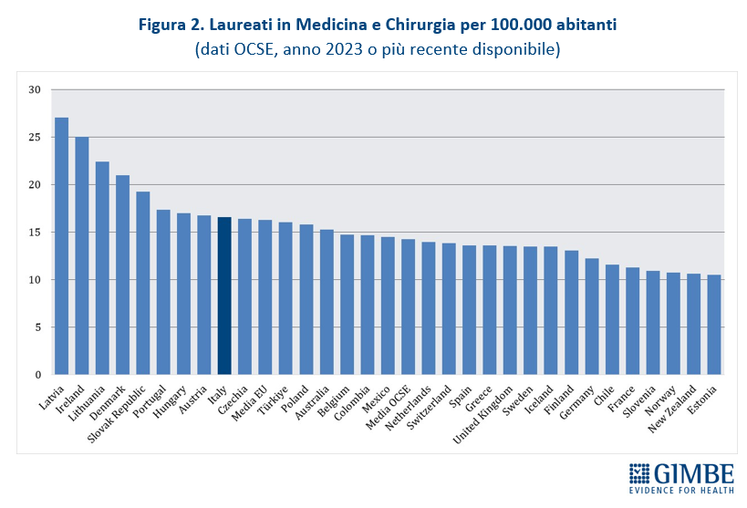 Nel 2023 i laureati in Medicina e Chirurgia sono stati 16,6 per 100 mila abitanti, un valore superiore alla media Ocse (14,3) e leggermente al di sopra della media europea (16,3), che posiziona l’Italia al nono posto tra i 31 Paesi considerati. «Questi dati – spiega Cartabellotta – confermano che i presupposti della riforma non si basavano su una carenza di medici in termini assoluti, né su un numero insufficiente di laureati in Medicina e Chirurgia».