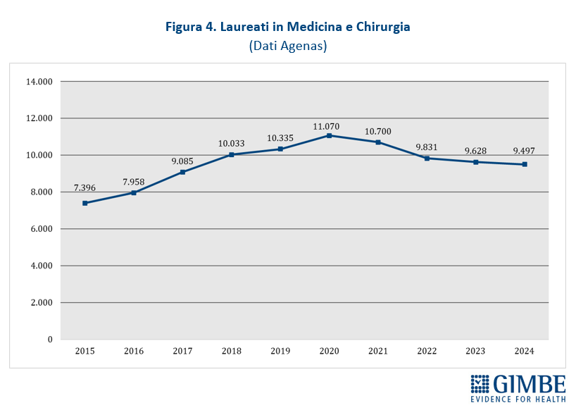 - Laureati: dal 2015 al 2024 si sono laureati in Medicina e Chirurgia 95.533 studenti, con un trend in crescita dai 7.396 del 2015 ai 9.497 del 2024 . La media annua dei laureati è passata da 8.961 nel periodo 2015-2019 a 10.145 nel periodo 2020-2024.