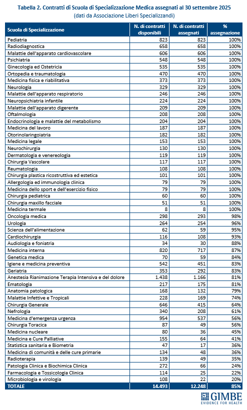 - Nel concorso 2025-2026, a fronte di 14.493 contratti, ne sono stati assegnati 12.248 (85%), ma con tassi di assegnazione bassi o molto bassi in aree cruciali per il funzionamento del SSN, come medicina d’emergenza-urgenza, chirurgia generale, medicina di comunità e delle cure primarie, radioterapia e tutte le specialità di laboratorio.