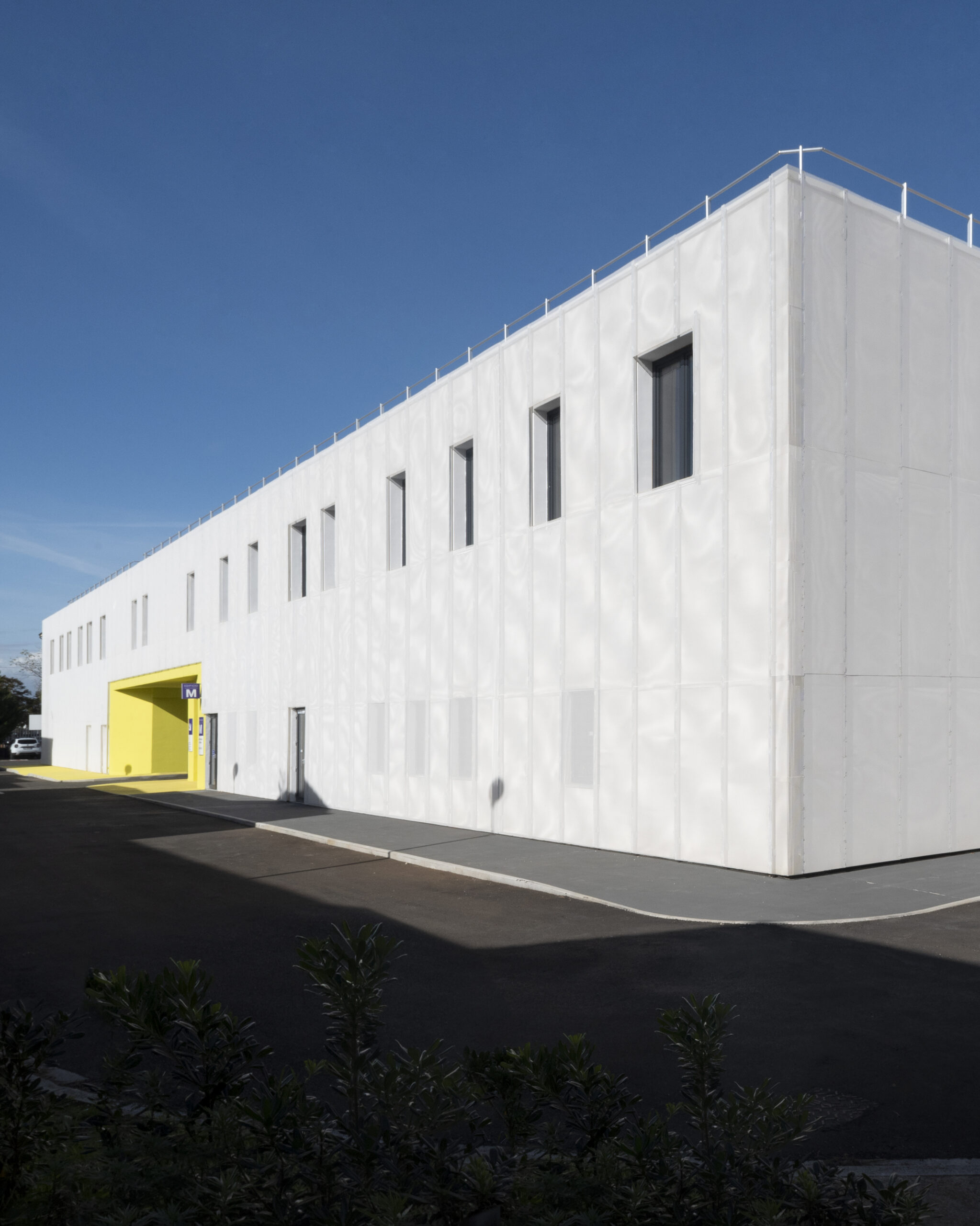 La forma dell’edificio, per esempio, era praticamente obbligata. Abbiamo interpretato questo limite come motivo per valorizzare l’immagine architettonica, attraverso elementi emergenti caratterizzati da un giallo dal tono vivace come la scala posta sulla facciata ovest, che spezza la rigida stereometria dell’edificio, e il percorso pedonale che dall’ingresso all’area ospedaliera distribuisce tutti gli ingressi pedonali e la camera calda.