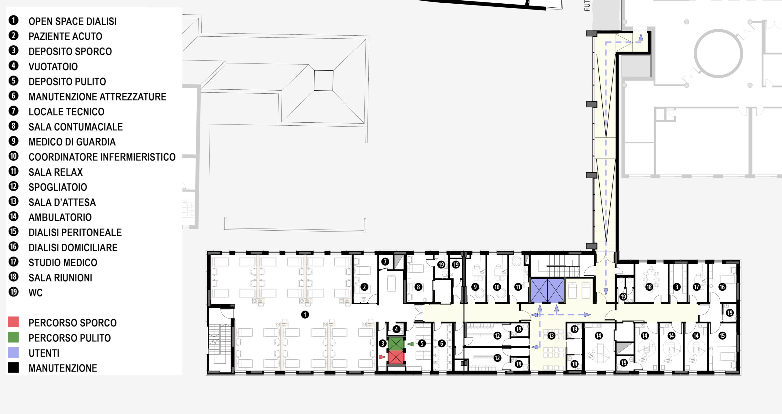 L’attenzione si è quindi concentrata sulle concrete aspettative dei pazienti, che spesso restano inespresse. L’emodialisi interessa persone di ogni tipo e condizione clinica, più volte alla settimana anche per lunghi periodi della giornata. La qualità dello spazio della terapia è stata quindi fra gli obiettivi principali di un progetto, caratterizzato anche dai vincoli insistenti sull’area d’intervento.